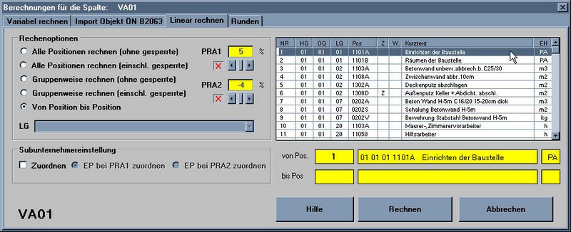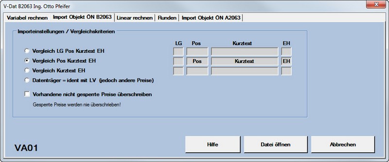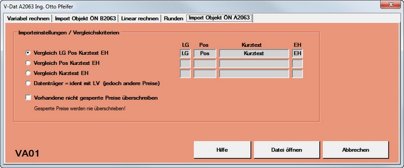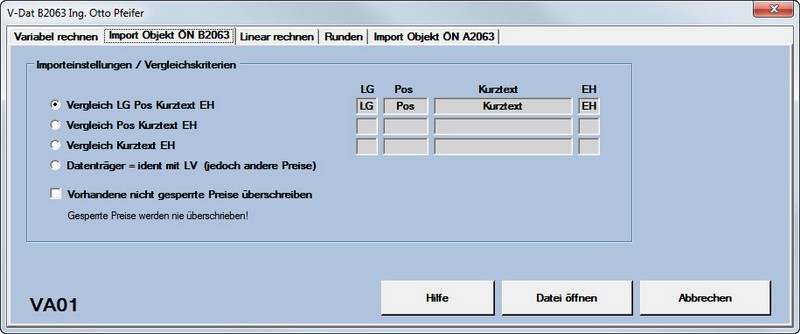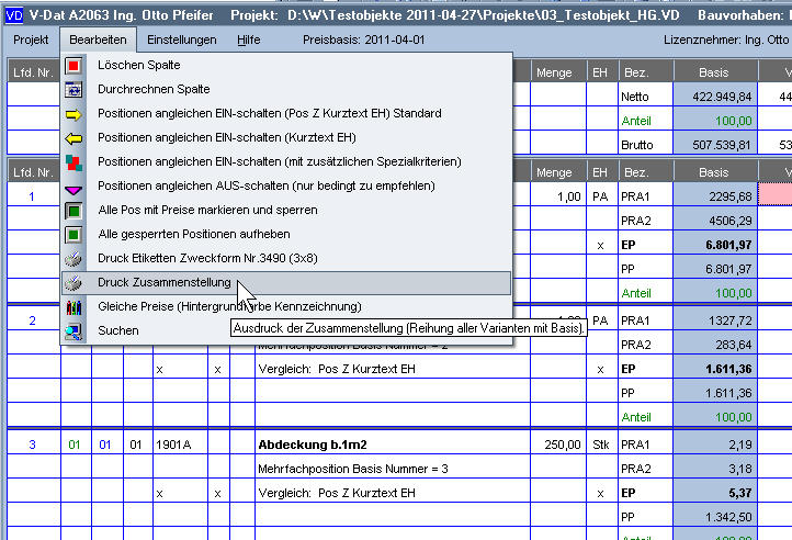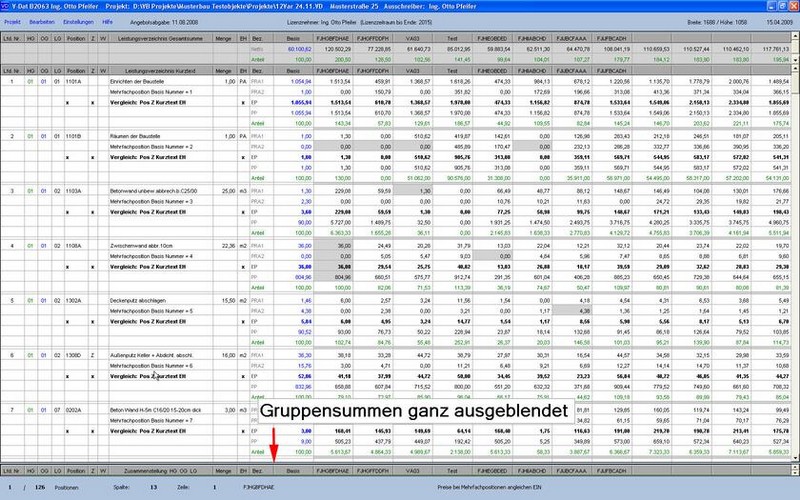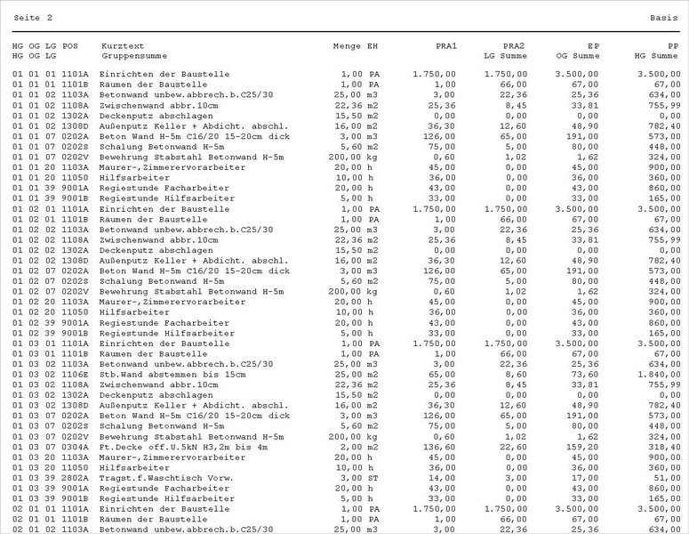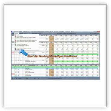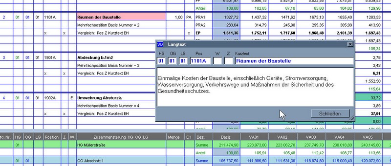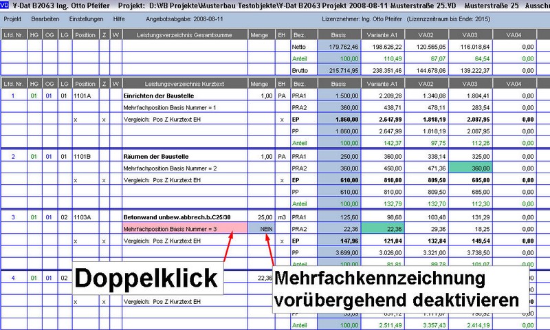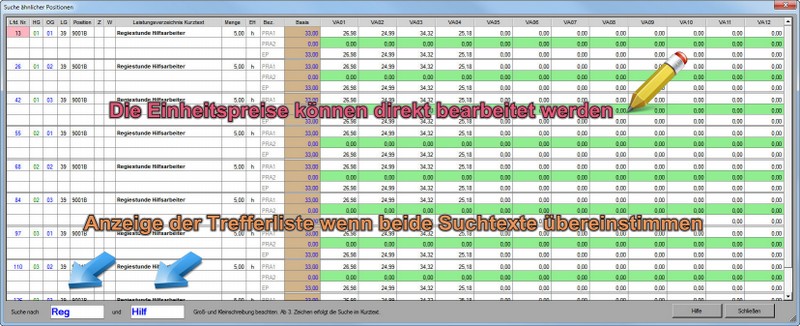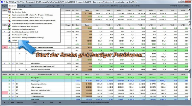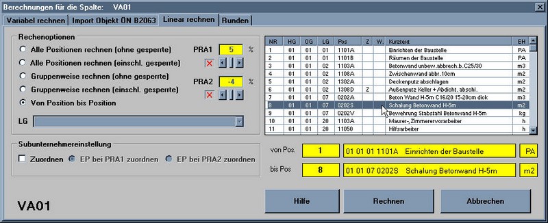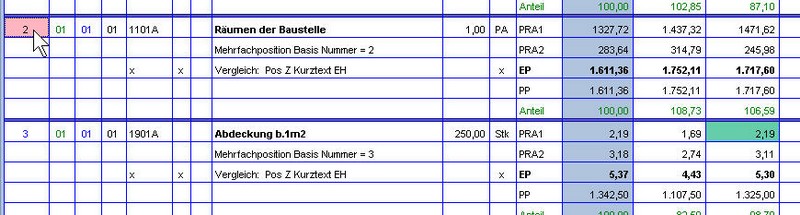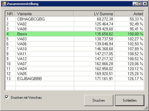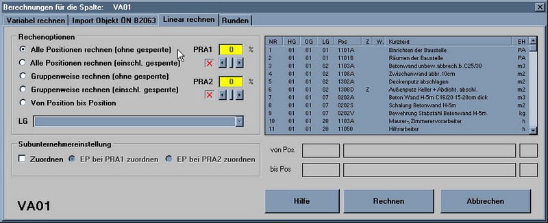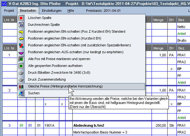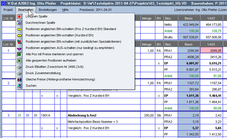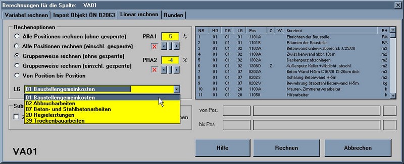Selbstverständlich werden auch bei den Varianten alle gleichen Positionen (mit gleicher LG-Nummer, gleicher Positionsnummer, gleichen Kurztext und gleicher Einheit) die Einheitspreise automatisch angeglichen. Es ist möglich bestimmte Positionen vorweg händisch einzugeben und diese Positionen dann für die automatischen Berechnungen zu sperren.