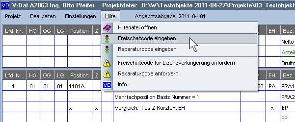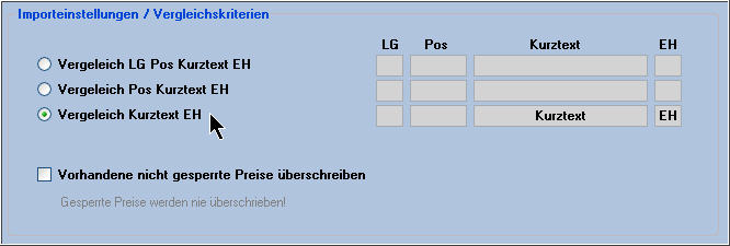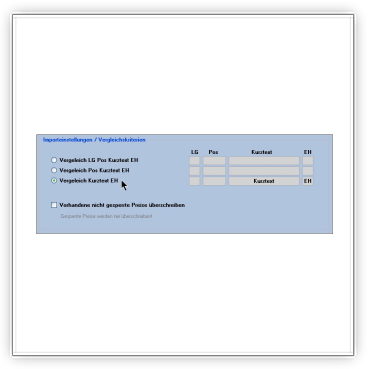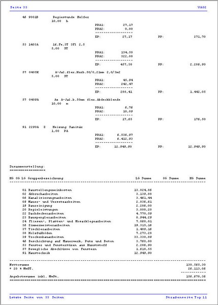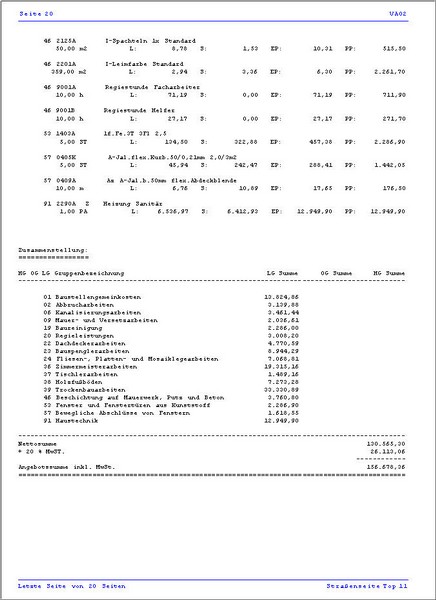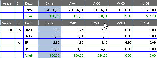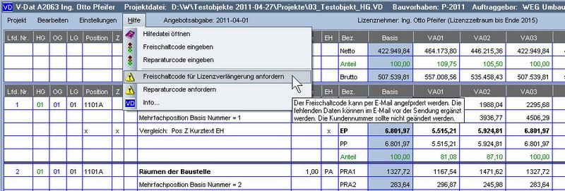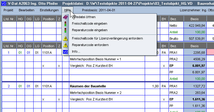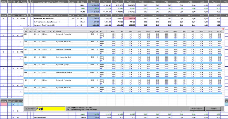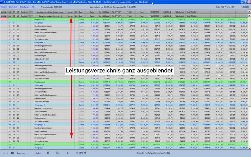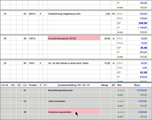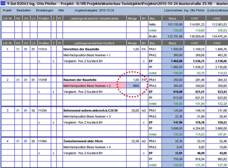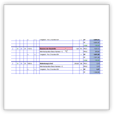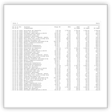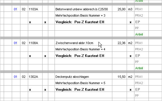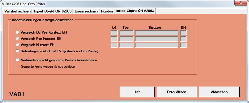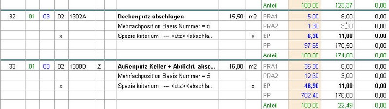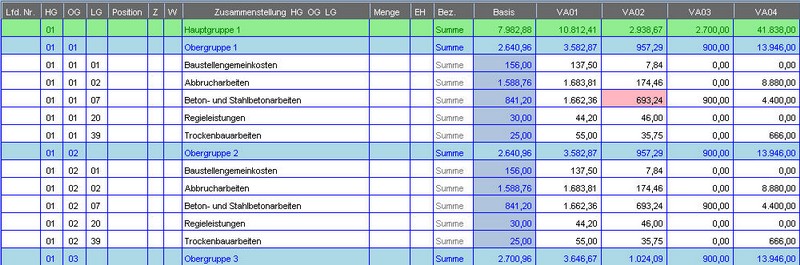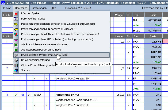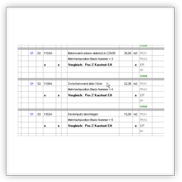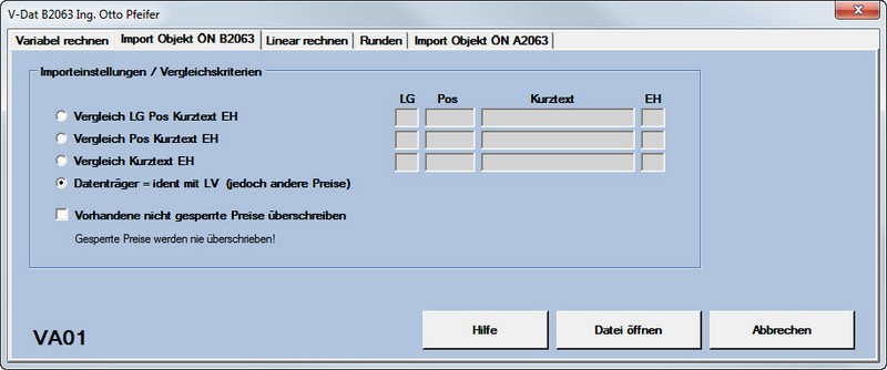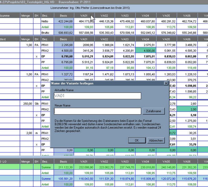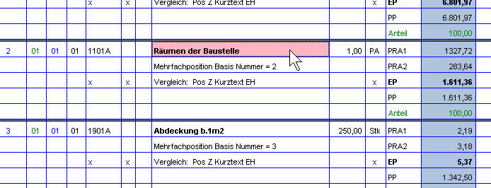 Selbstverständlich werden auch bei den Varianten alle gleichen Positionen (mit gleicher LG-Nummer, gleicher Positionsnummer, gleichen Kurztext und gleicher Einheit) die Einheitspreise automatisch angeglichen. Es ist möglich bestimmte Positionen vorweg händisch einzugeben und diese Positionen dann für die automatischen Berechnungen zu sperren.