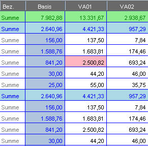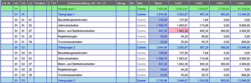 Selbstverständlich werden auch bei den Varianten alle gleichen Positionen (mit gleicher LG-Nummer, gleicher Positionsnummer, gleichen Kurztext und gleicher Einheit) die Einheitspreise automatisch angeglichen. Es ist möglich bestimmte Positionen vorweg händisch einzugeben und diese Positionen dann für die automatischen Berechnungen zu sperren.