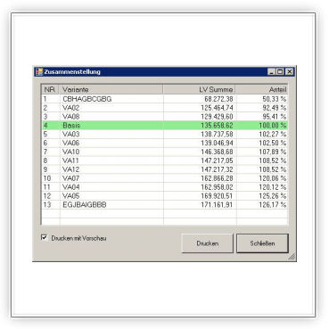 Fehler in der Preisgestaltung werden dabei sicher und rasch erkannt. Die Einheitspreise bei den Varianten können durch verschiedene automatische Rechenhilfen mit Vorgabe einstellbarer Limits vorgegeben und händisch korrigiert werden.
